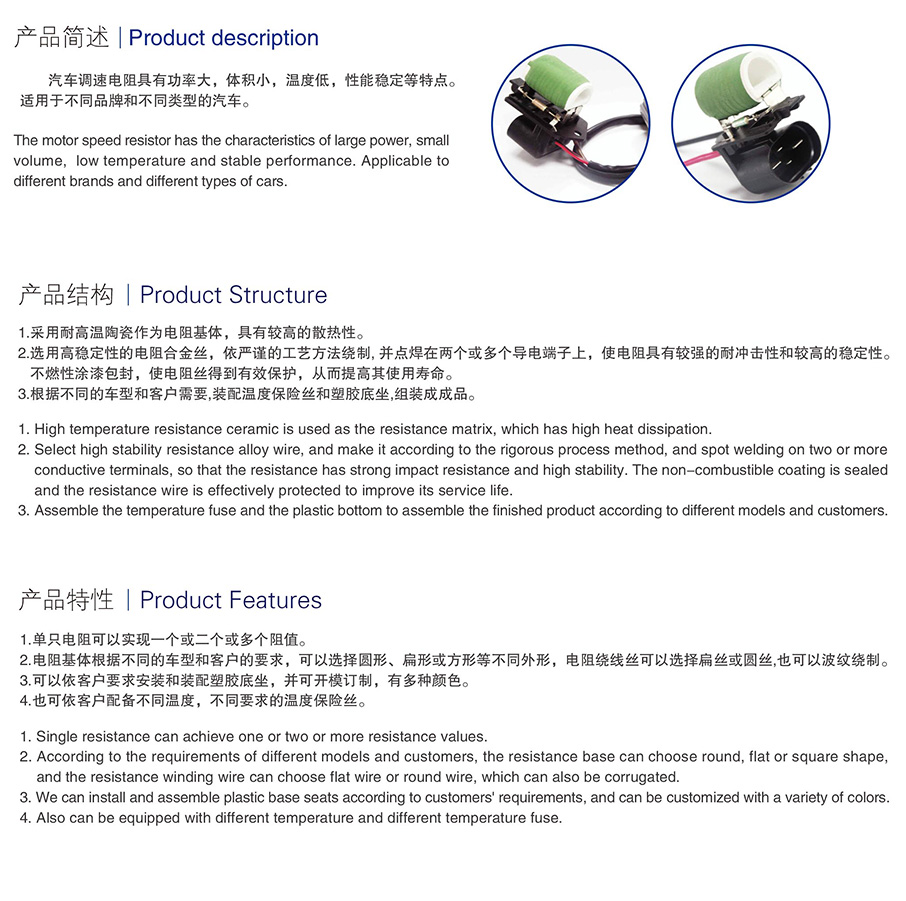 產(chǎn)品特點(diǎn):1.同等規(guī)格高于同行或要求的1.2倍余量生產(chǎn),功率更足,可以頻繁沖擊,可以長時(shí)間負(fù)載。 2.選用優(yōu)質(zhì)穩(wěn)定材料,且線徑高于同行1.2倍以上,電阻不易燒和開路,性能更加穩(wěn)定,更經(jīng)久耐用。 3.安全結(jié)構(gòu)設(shè)計(jì),完美獨(dú)特焊接工藝,電阻絲成分均勻一致。